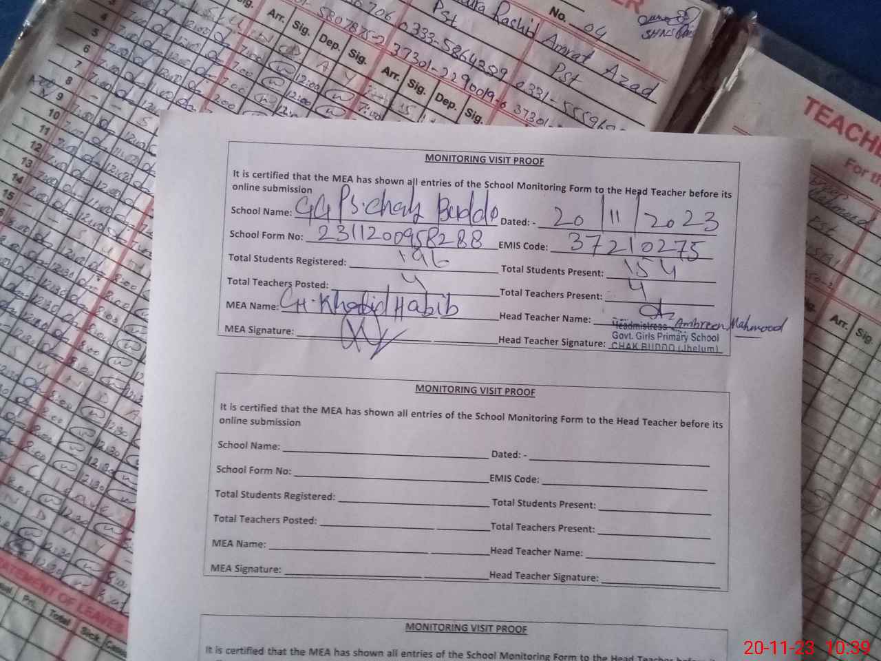 | Attendance Register | Head Teacher | MEA with School | Visit Proof |