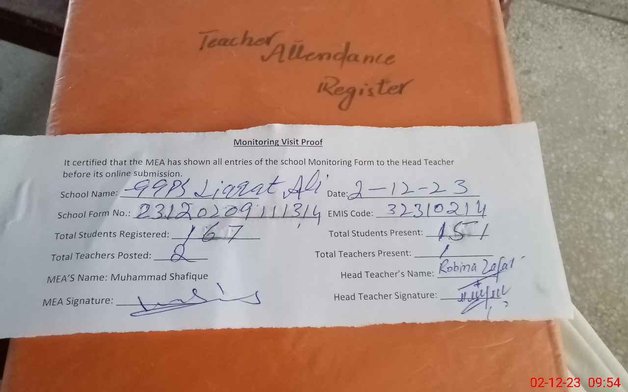 | Attendance Register | Head Teacher | MEA with School | Visit Proof |
