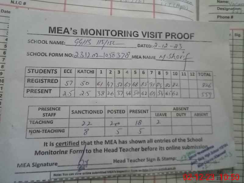 | Attendance Register | Head Teacher | MEA with School | Visit Proof |