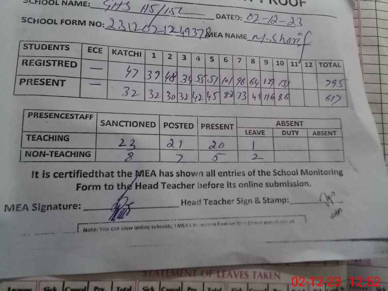 | Attendance Register | Head Teacher | MEA with School | Visit Proof |