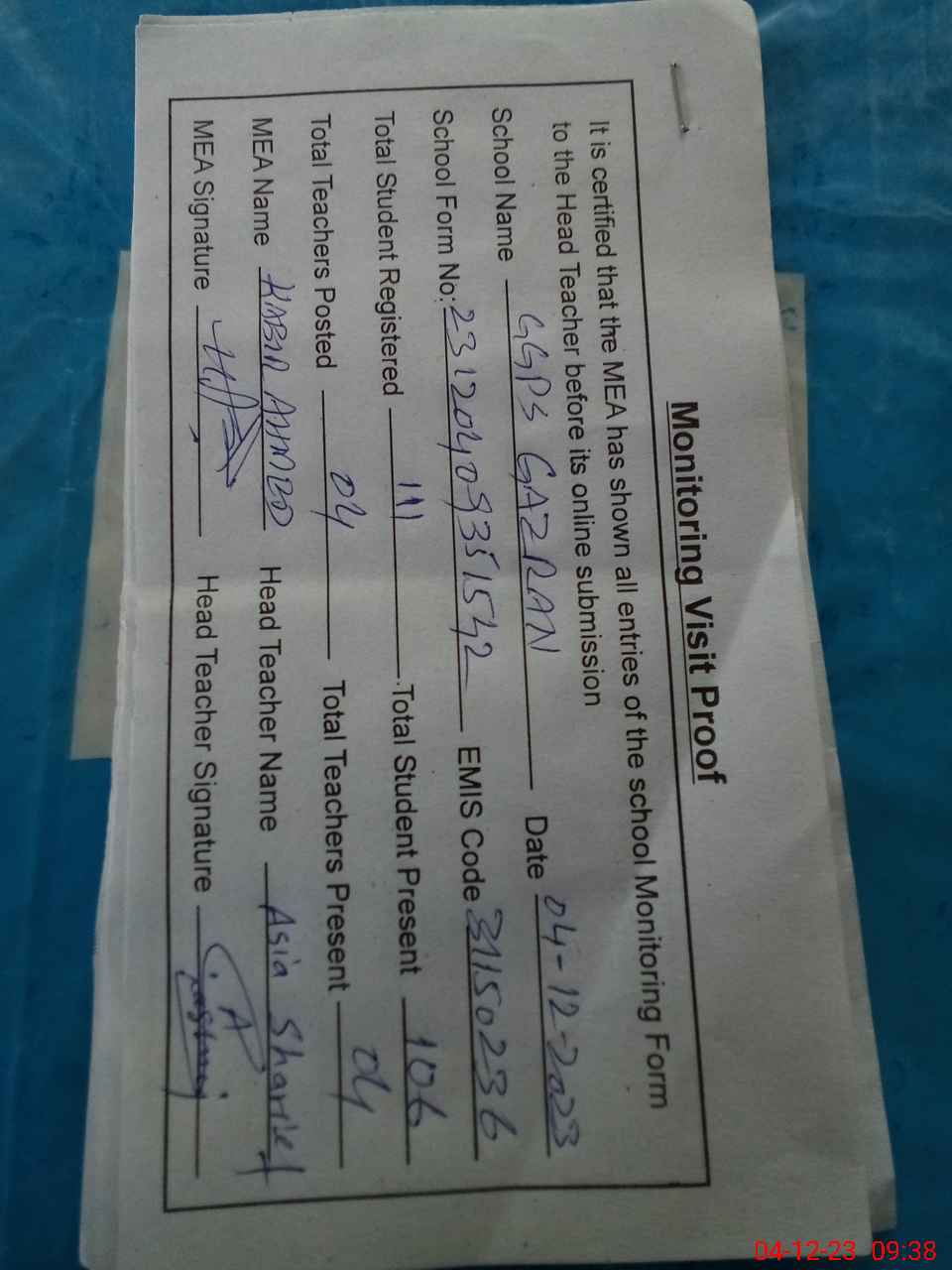 | Attendance Register | Head Teacher | MEA with School | Visit Proof |