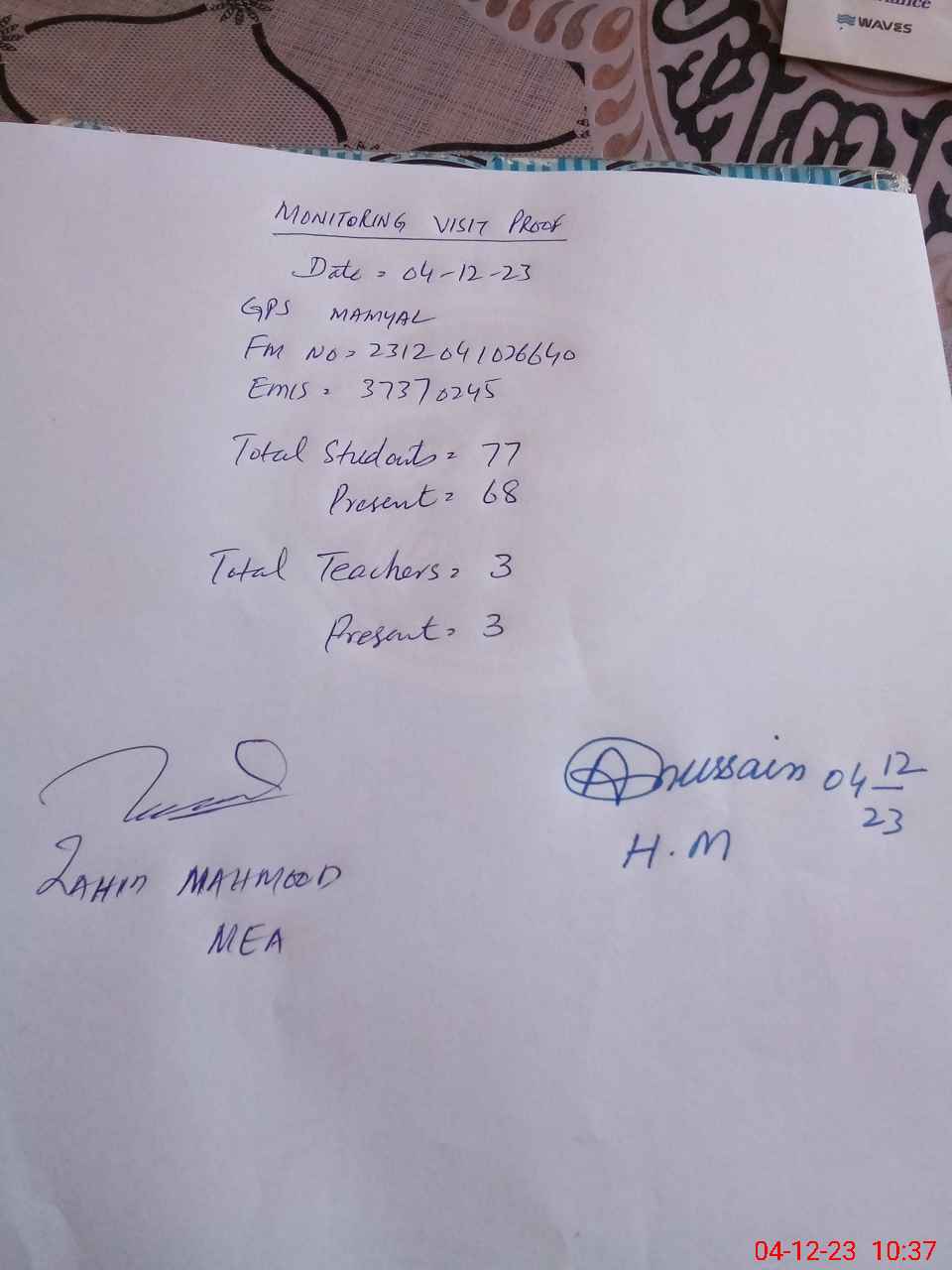 | Attendance Register | Head Teacher | MEA with School | Visit Proof |