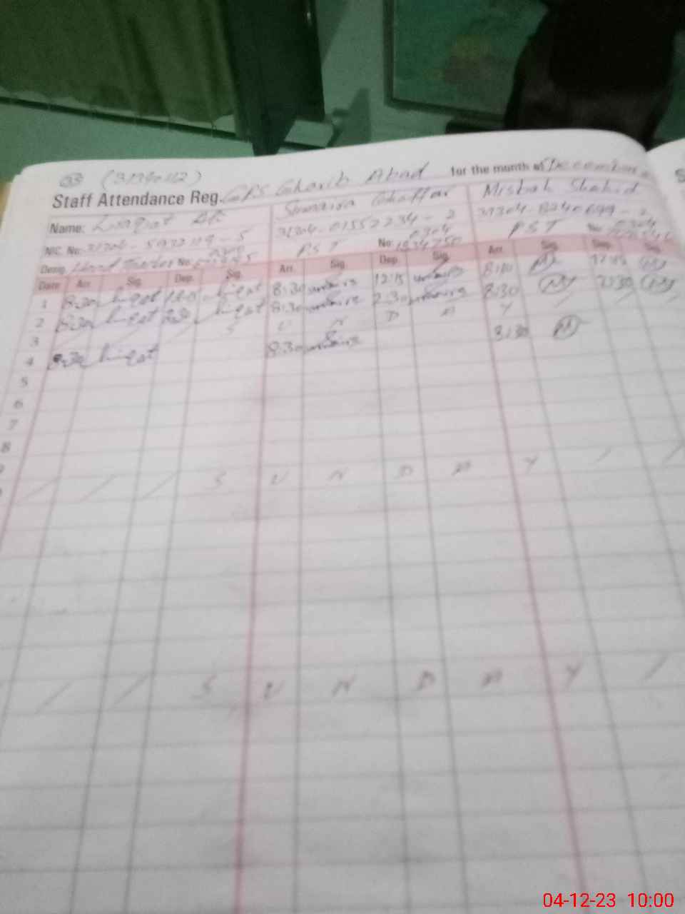 | CNIC | Full Name | Designation | R/C | Absence During Last Calender Month |
