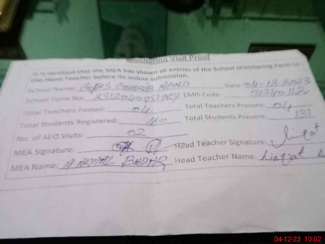 | Attendance Register | Head Teacher | MEA with School | Visit Proof |