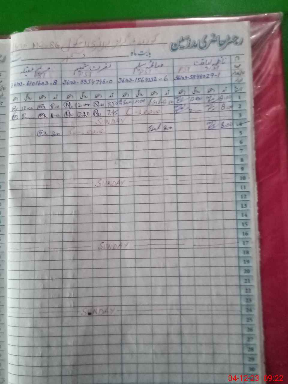 | CNIC | Full Name | Designation | R/C | Absence During Last Calender Month |