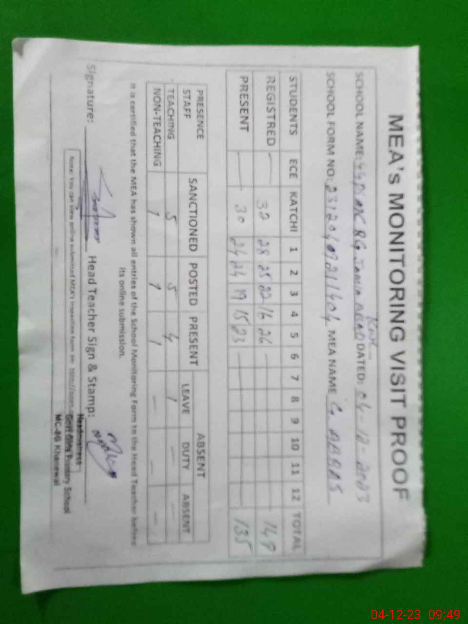 | Attendance Register | Head Teacher | MEA with School | Visit Proof |