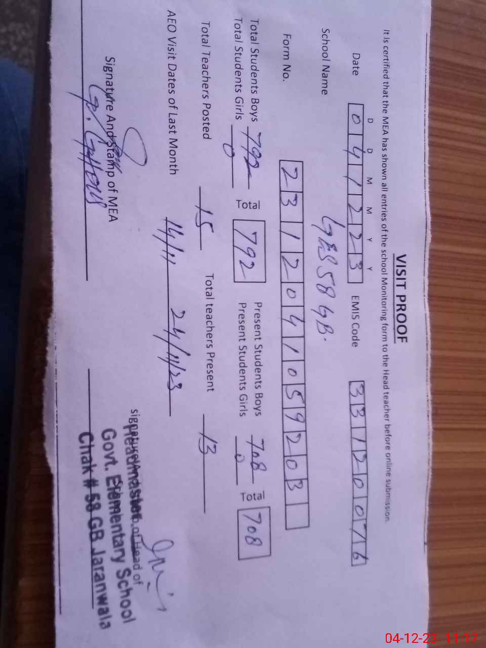 | Attendance Register | Head Teacher | MEA with School | Visit Proof |