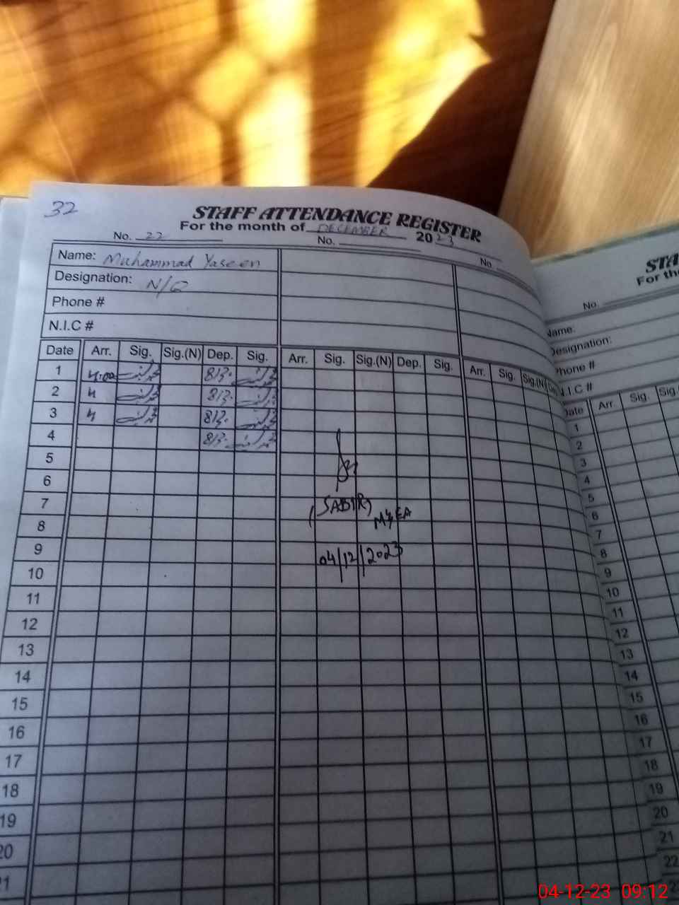 | CNIC | Full Name | Designation | R/C | Absence During Last Calender Month |
