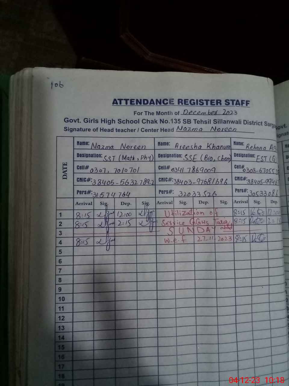 | Remarks (Use Separate Page if Required): Areesha khanum SSE temporary attached to GGHS Tariq Abad W E F 27 Nov 2023 | |||||