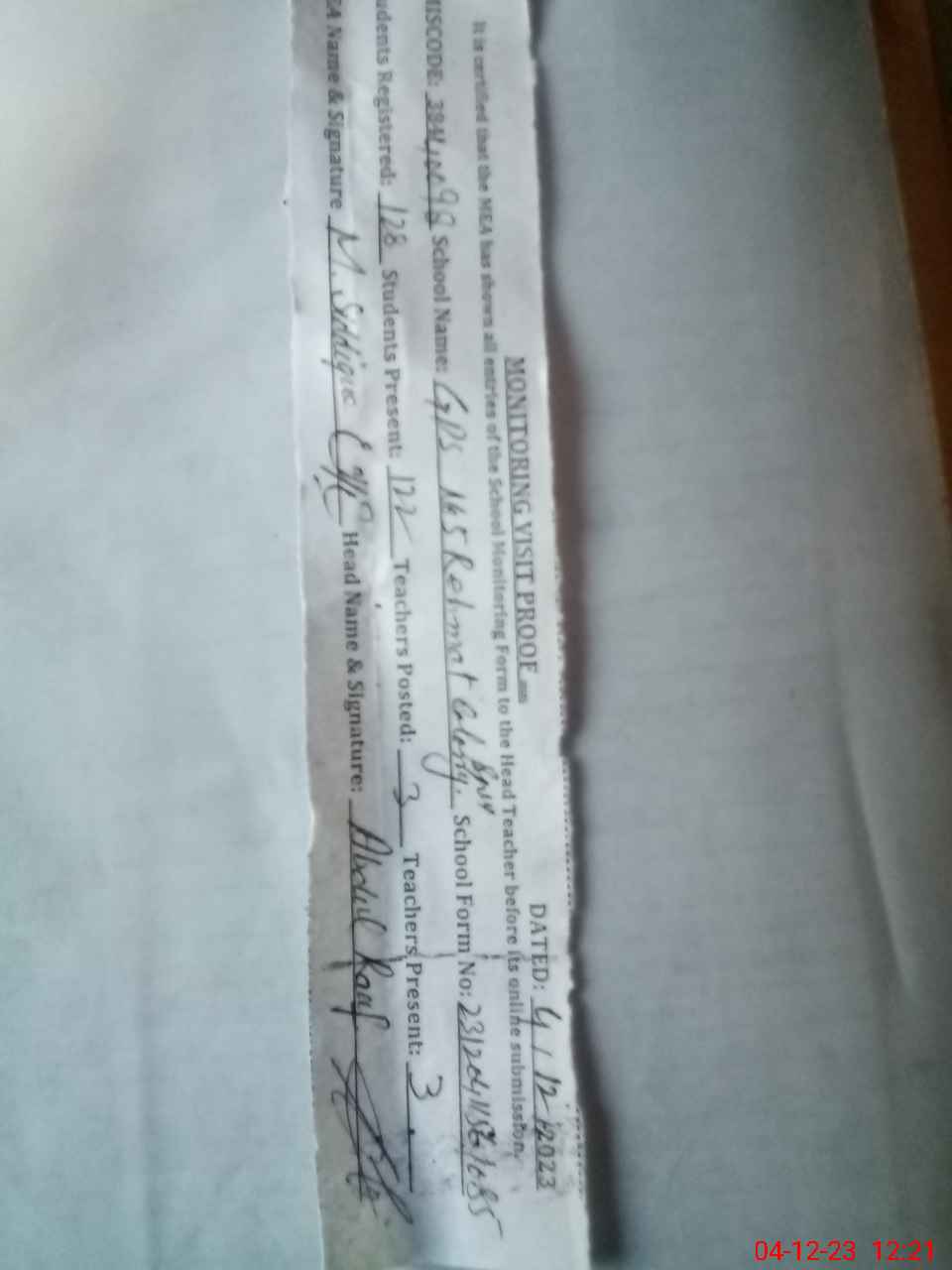 | Attendance Register | Head Teacher | MEA with School | Visit Proof |