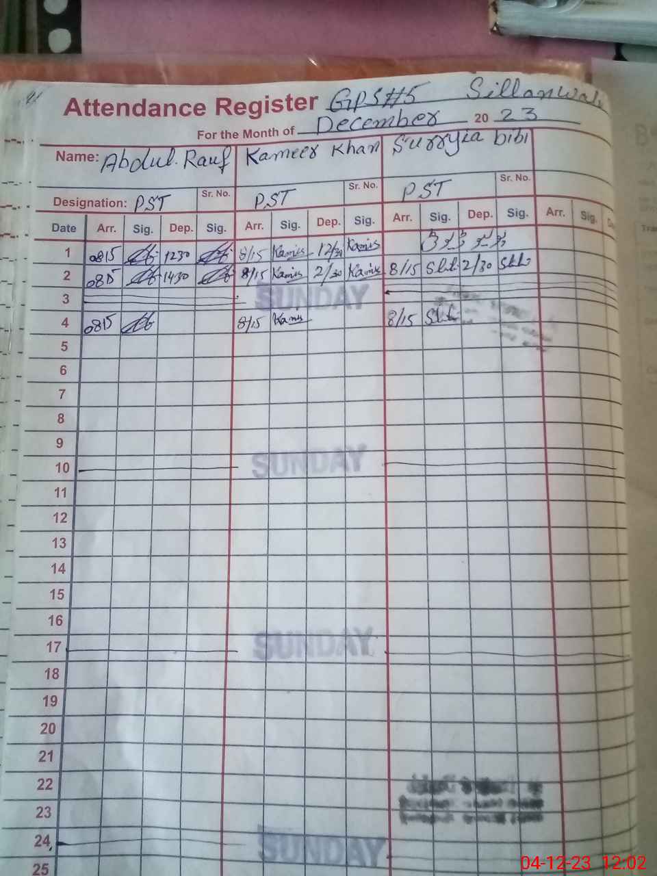 | CNIC | Full Name | Designation | R/C | Absence During Last Calender Month |