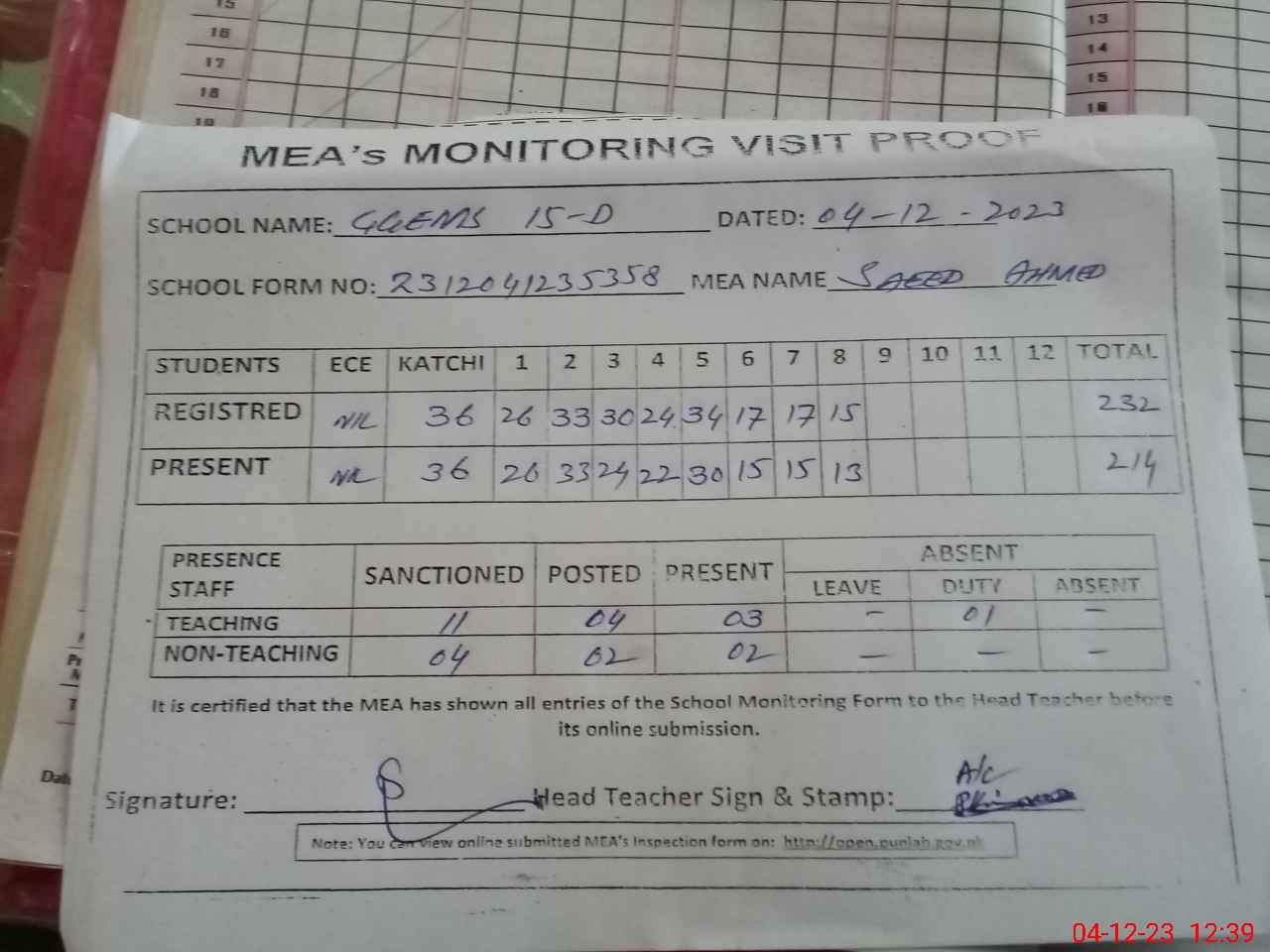 | Attendance Register | Head Teacher | MEA with School | Visit Proof |