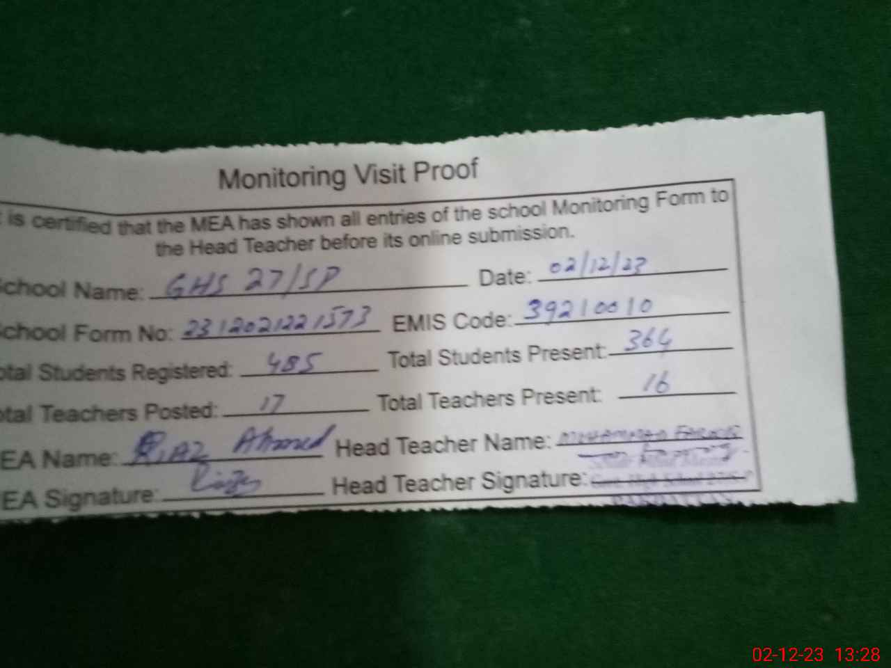 | EMIS Code: 39210010 | Name of School: GHS 27 SP | |||