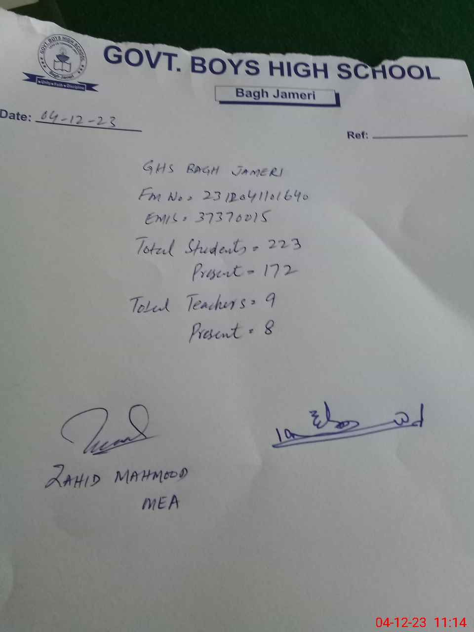 | EMIS Code: 37370015 | Name of School: GHS BAGH JAMERI | |||