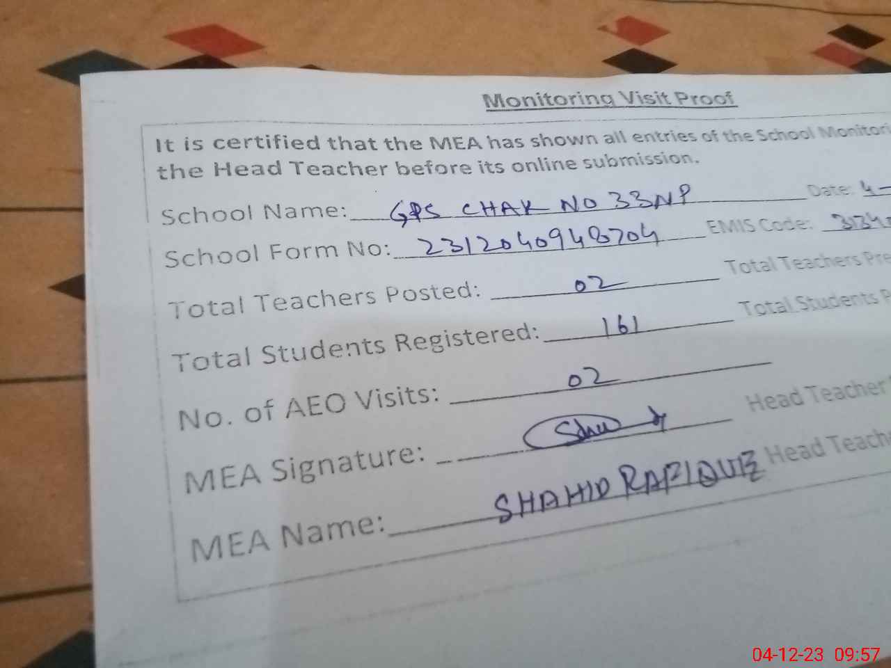 | Attendance Register | Head Teacher | MEA with School | Visit Proof |