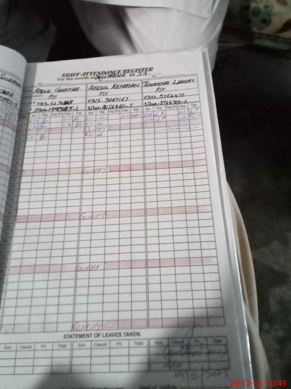 | CNIC | Full Name | Designation | R/C | Absence During Last Calender Month |