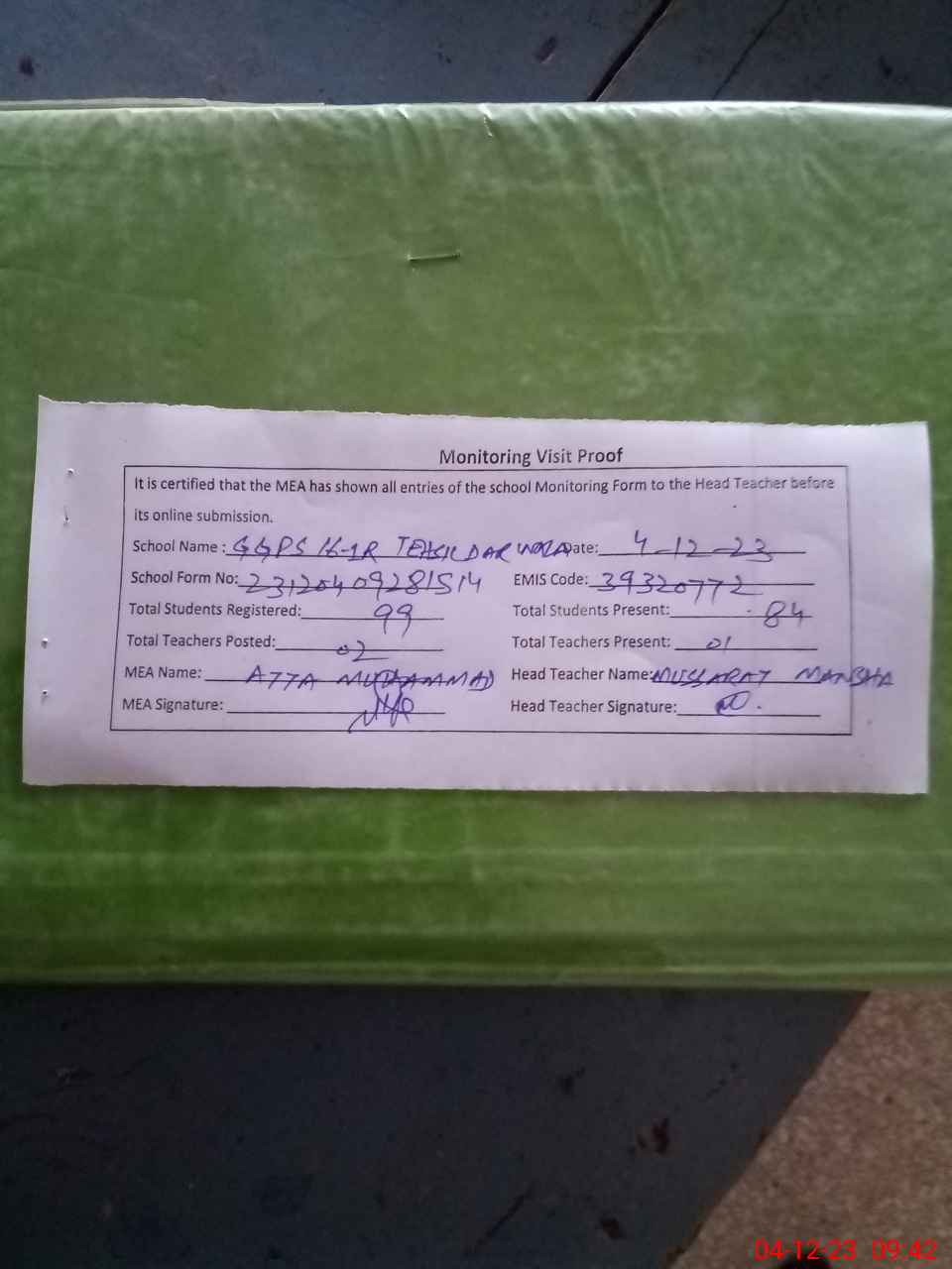 | Attendance Register | Head Teacher | MEA with School | Visit Proof |