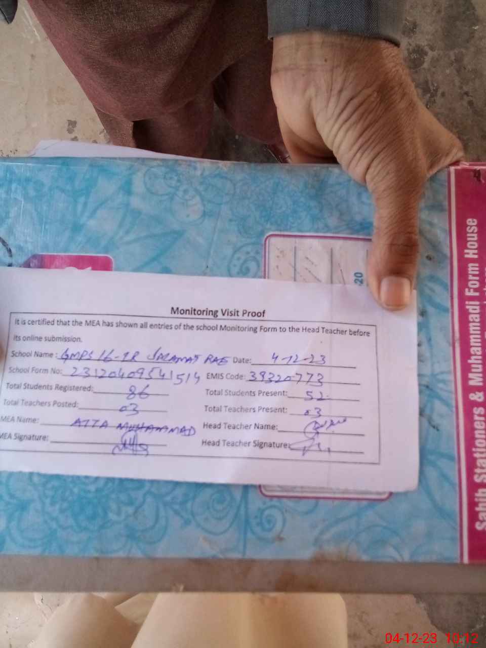 | Attendance Register | Head Teacher | MEA with School | Visit Proof |