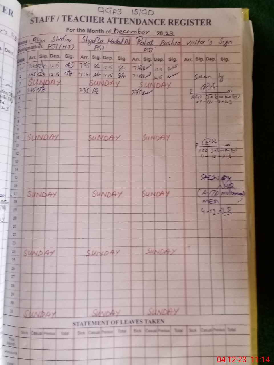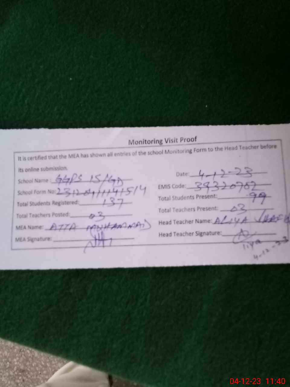| Attendance Register | Head Teacher | MEA with School | Visit Proof |