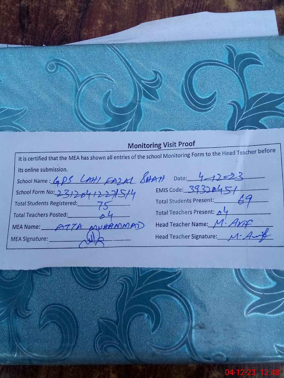 | Attendance Register | Head Teacher | MEA with School | Visit Proof |
