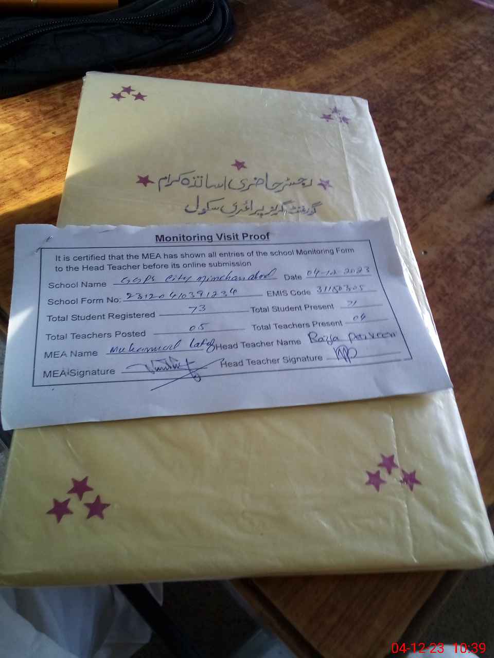 | Attendance Register | Head Teacher | MEA with School | Visit Proof |