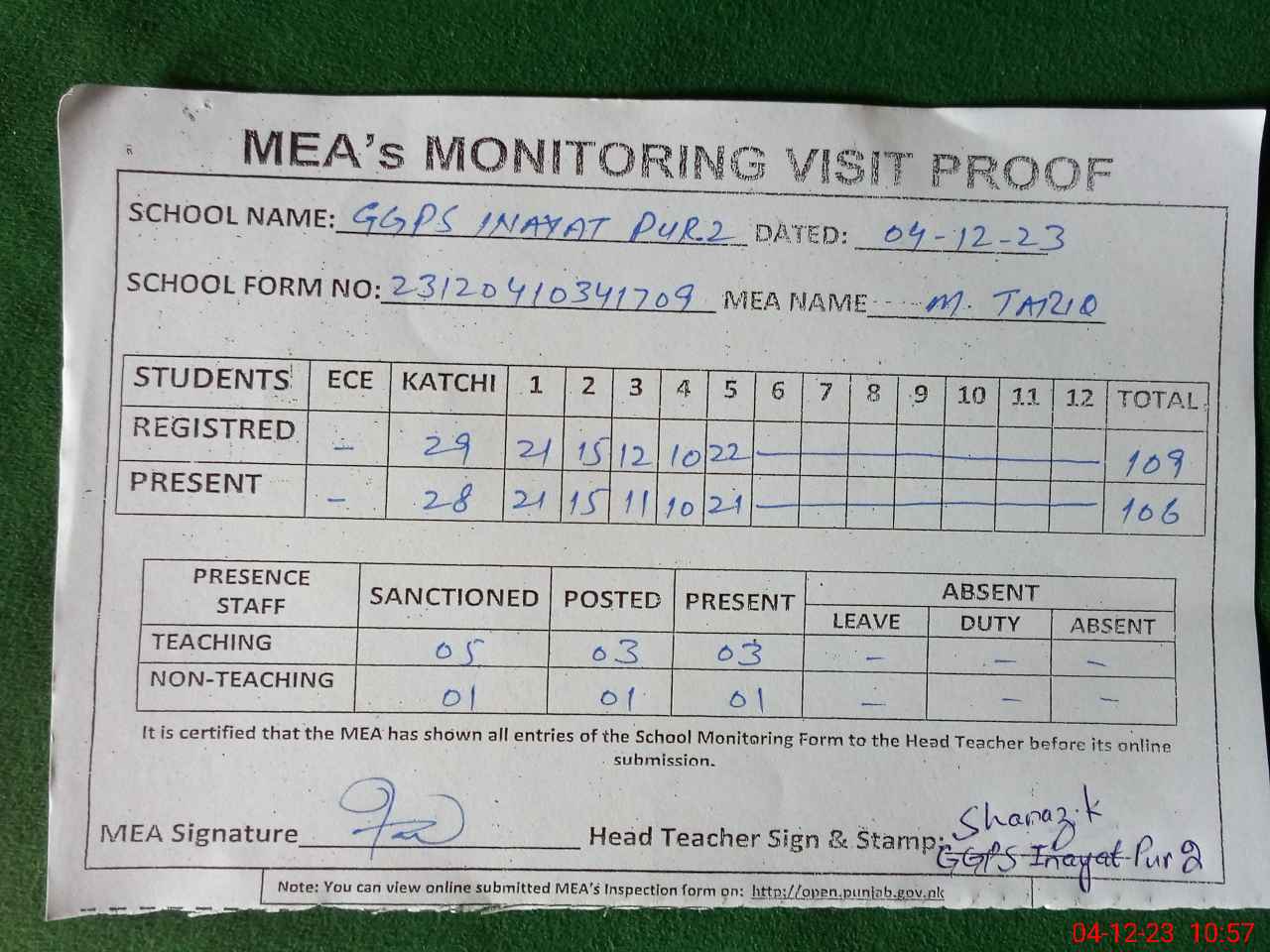 | Attendance Register | Head Teacher | MEA with School | Visit Proof |