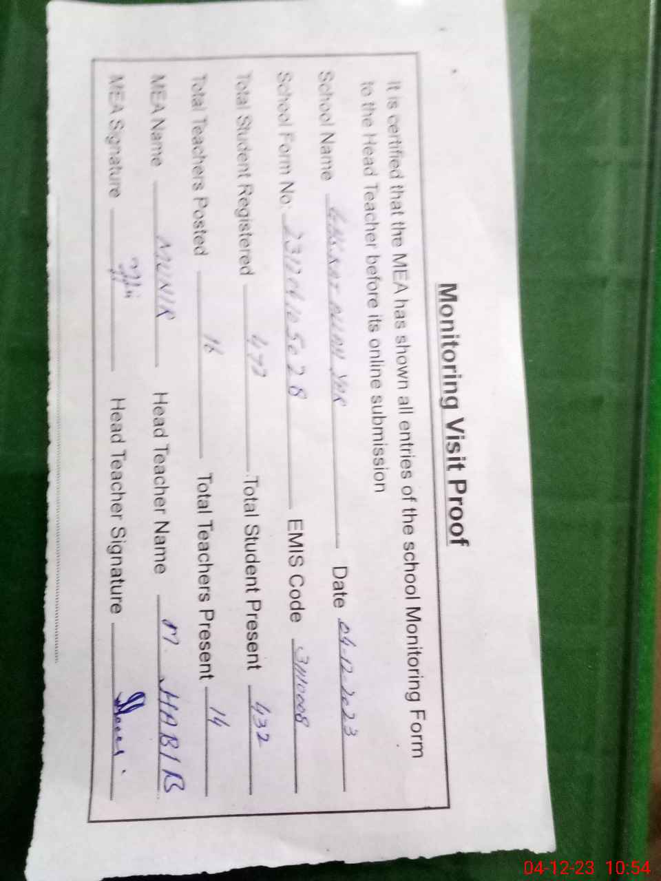 | Attendance Register | Head Teacher | MEA with School | Visit Proof |