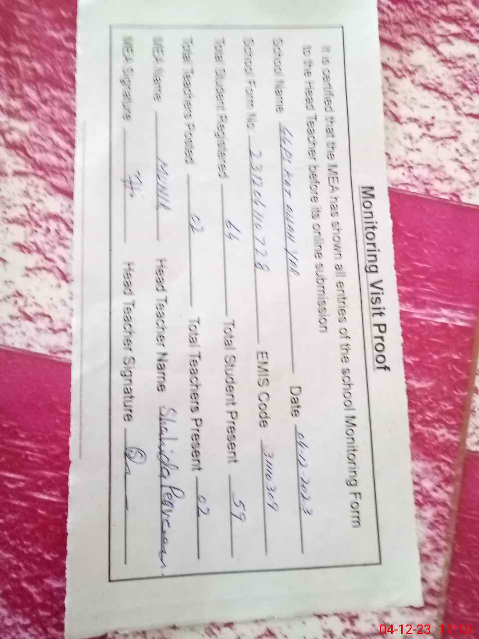 | Attendance Register | Head Teacher | MEA with School | Visit Proof |
