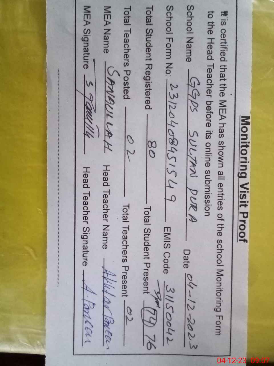 | EMIS Code: 31150042 | Name of School: GGPS SULTAN PURA | |||