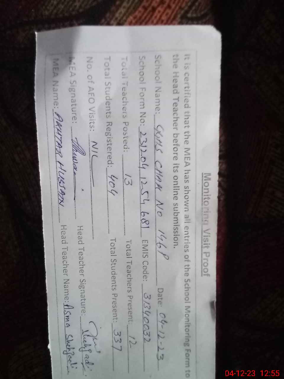 | Attendance Register | Head Teacher | MEA with School | Visit Proof |