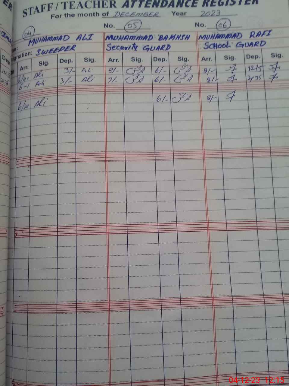 | CNIC | Full Name | Designation | R/C | Absence During Last Calender Month |