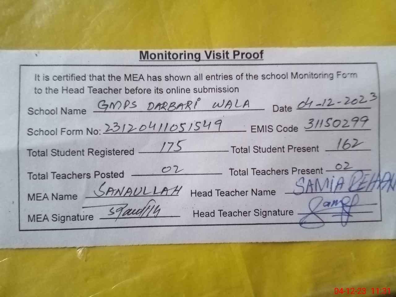 | EMIS Code: 31150299 | Name of School: GMPS DARBARI WALA | |||