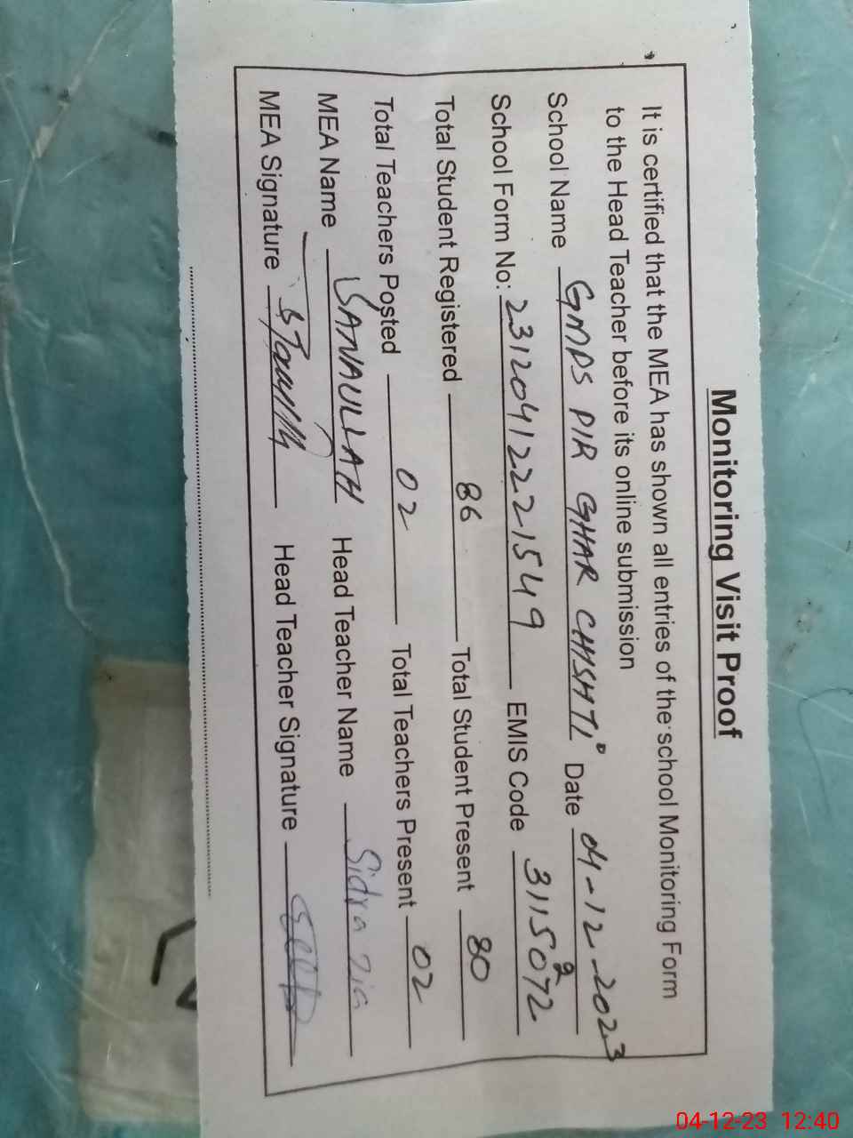 | EMIS Code: 31150272 | Name of School: GMPS PIR GHAR CHISHTI | |||
