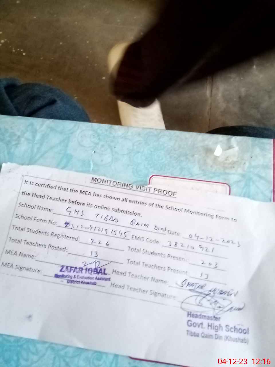 | Attendance Register | Head Teacher | MEA with School | Visit Proof |