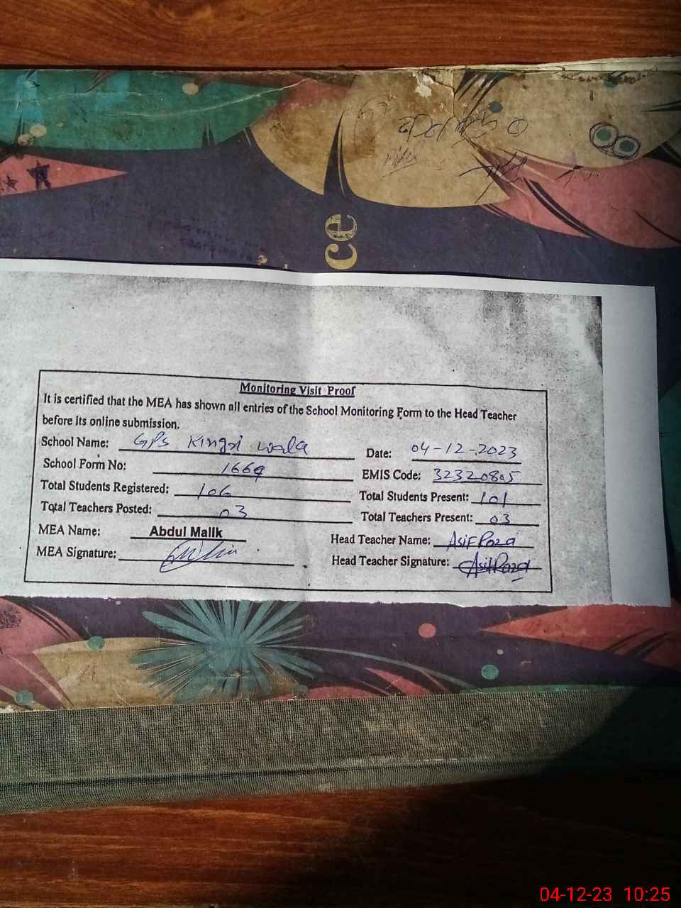 | EMIS Code: 32320805 | Name of School: GPS KINGRI WALA | |||