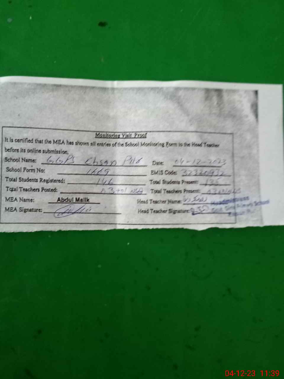 | Attendance Register | Head Teacher | MEA with School | Visit Proof |