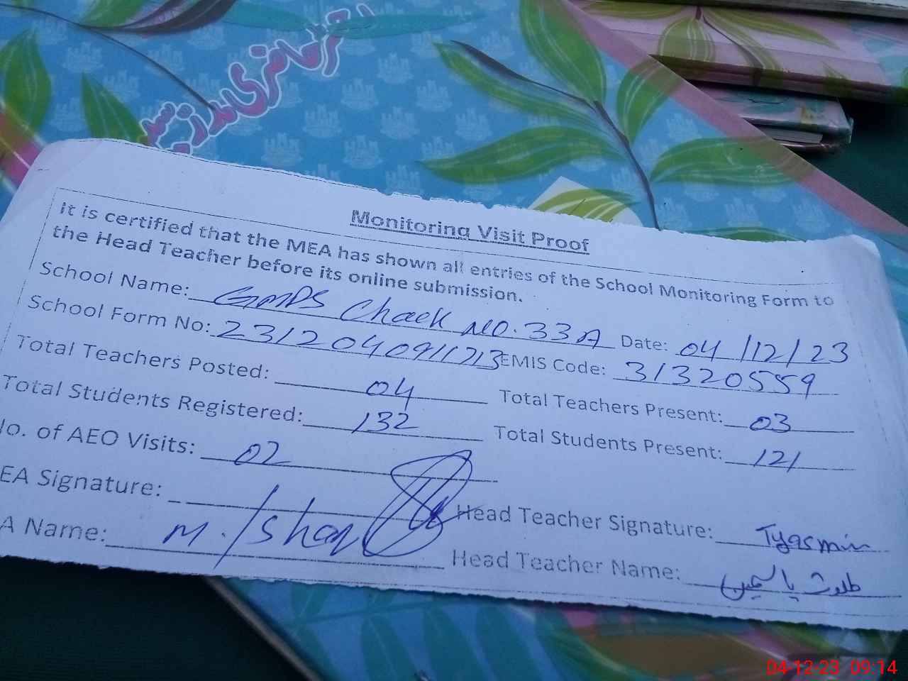 | Attendance Register | Head Teacher | MEA with School | Visit Proof |