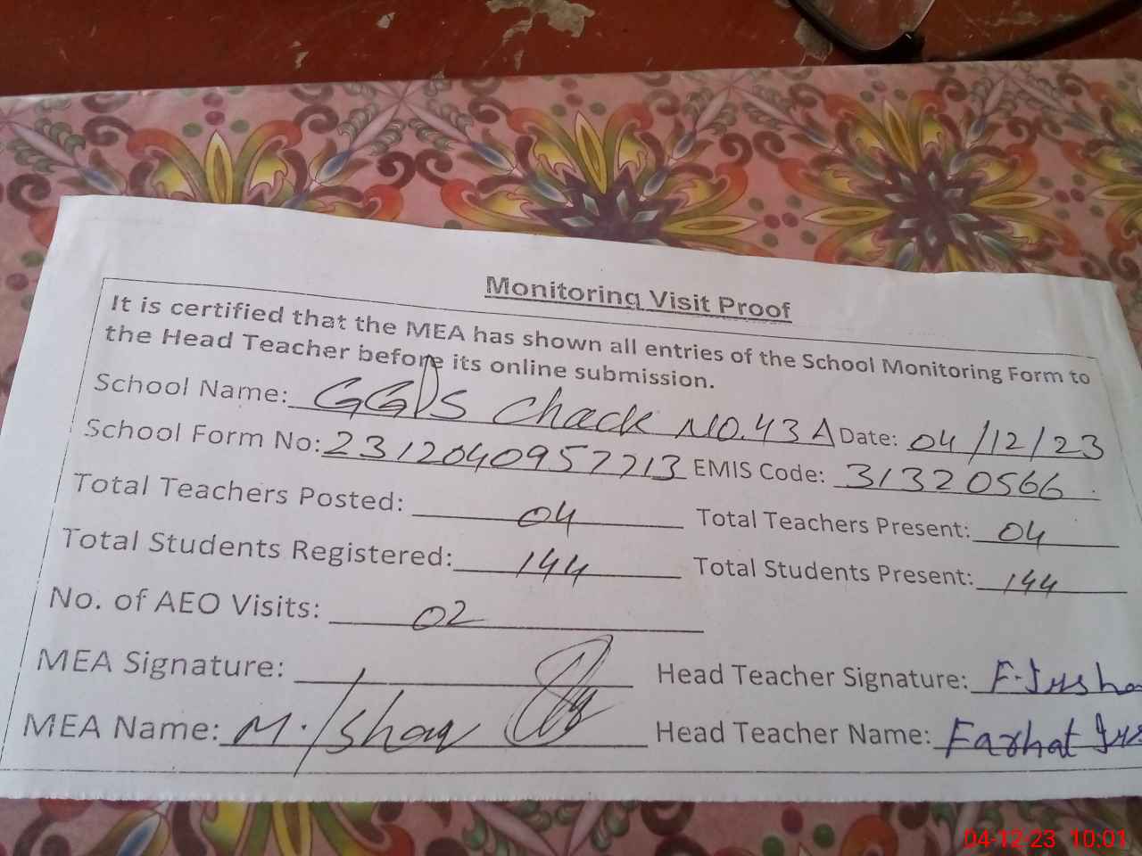 | Attendance Register | Head Teacher | MEA with School | Visit Proof |