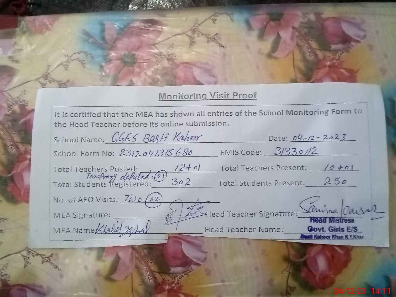 | Attendance Register | Head Teacher | MEA with School | Visit Proof |