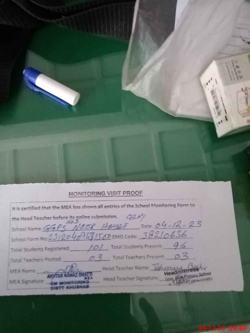 | Attendance Register | Head Teacher | MEA with School | Visit Proof |