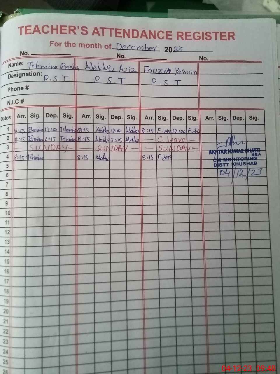 | CNIC | Full Name | Designation | R/C | Absence During Last Calender Month |