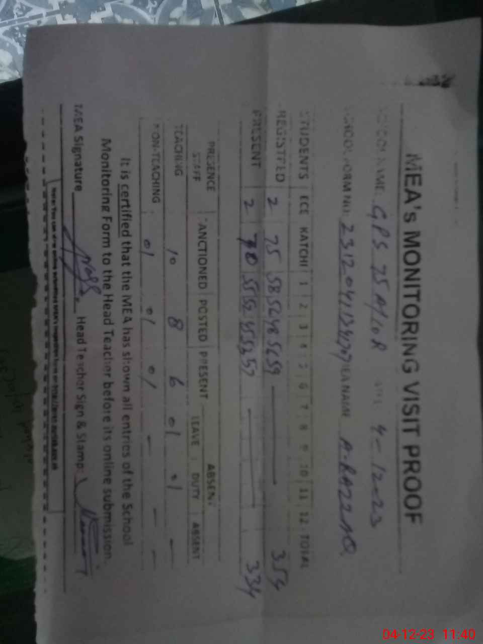 | Attendance Register | Head Teacher | MEA with School | Visit Proof |