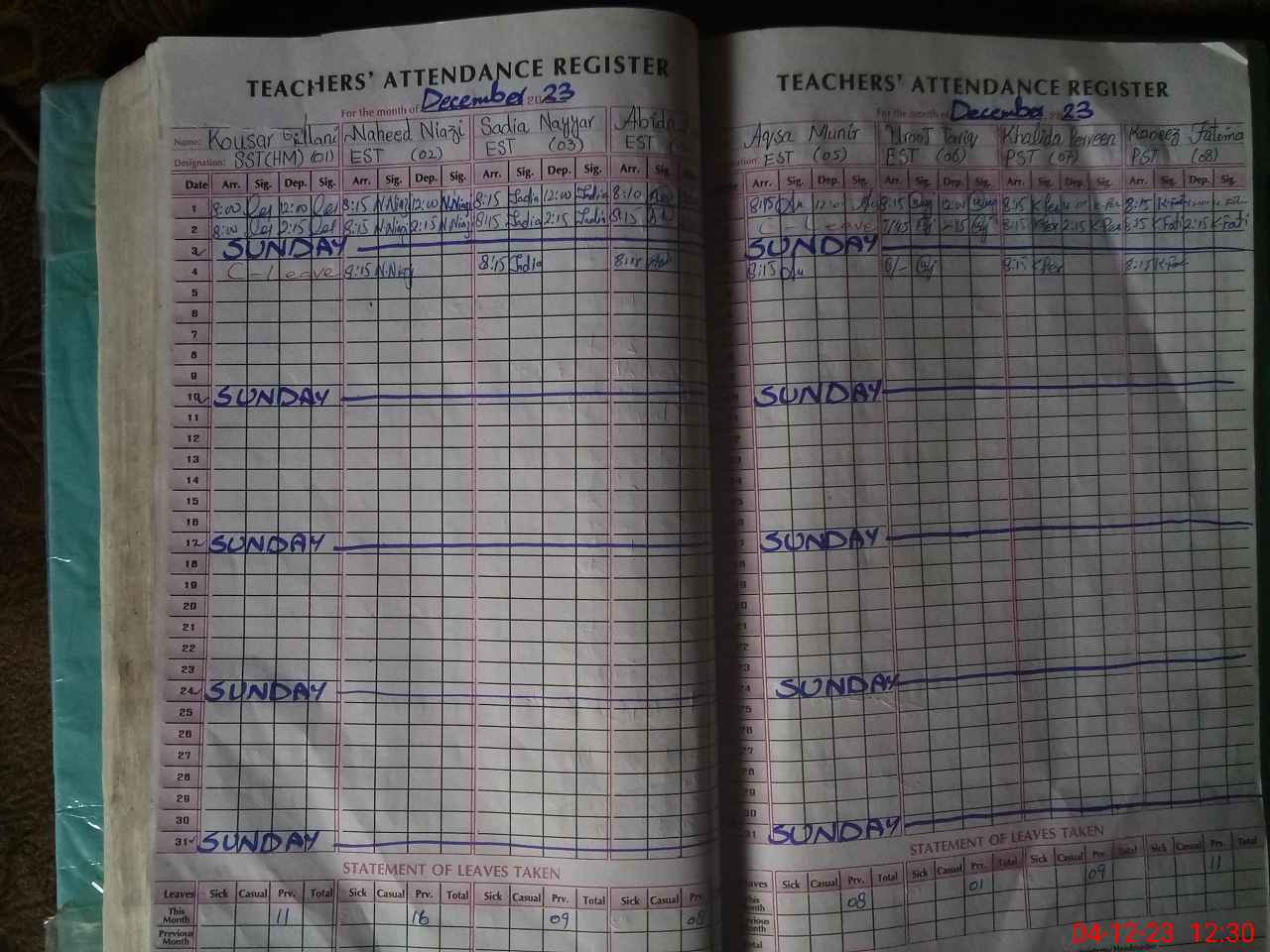 | Leave | Duty | Absent | Maternity | Medical | Ex- Pak |