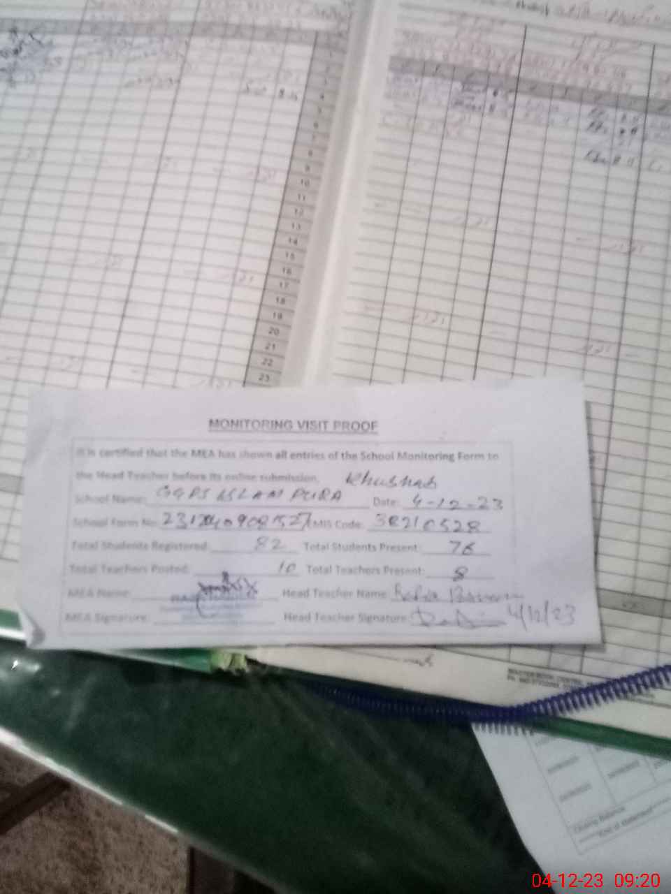 | Attendance Register | Head Teacher | MEA with School | Visit Proof |