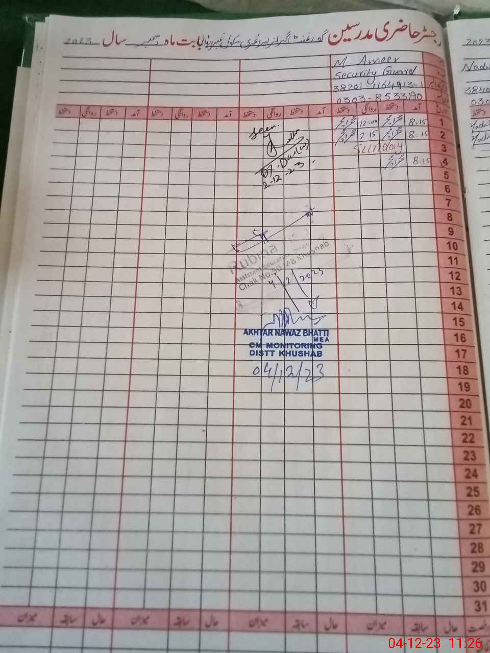 | CNIC | Full Name | Designation | R/C | Absence During Last Calender Month |