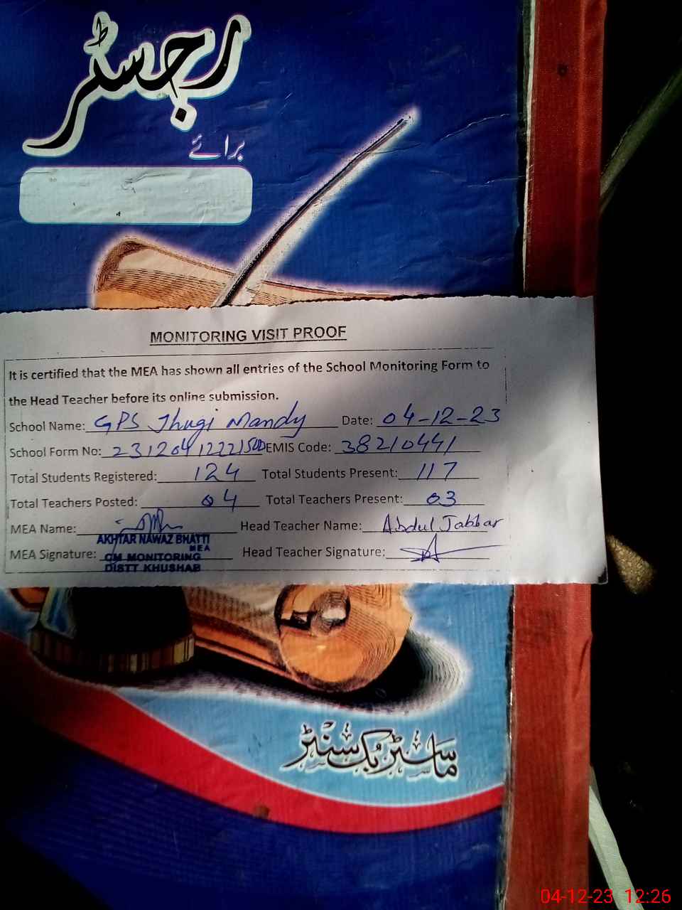 | Attendance Register | Head Teacher | MEA with School | Visit Proof |