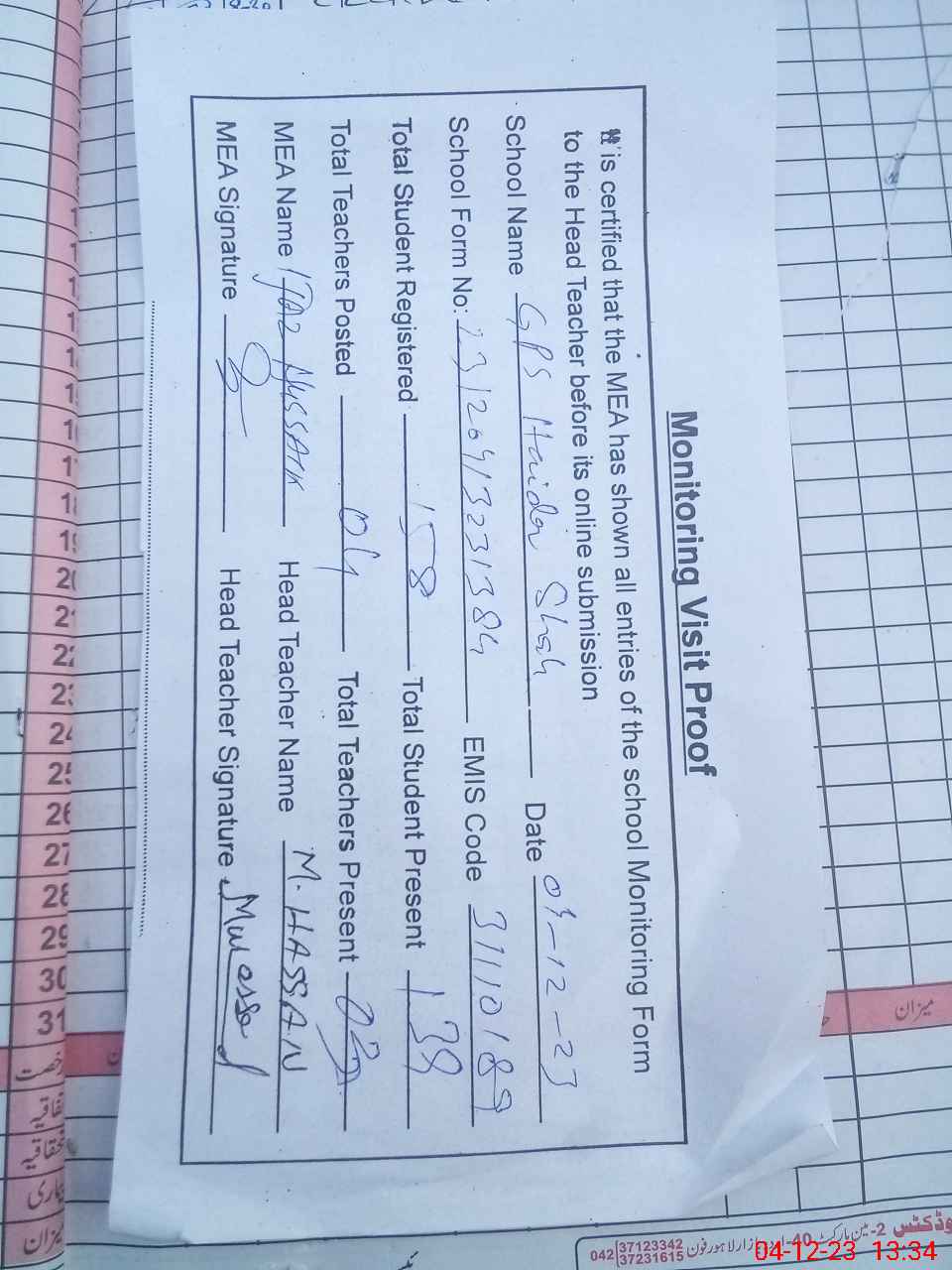 | Attendance Register | Head Teacher | MEA with School | Visit Proof |