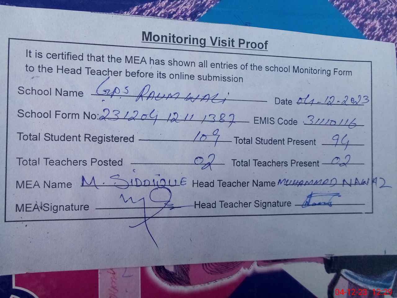 | EMIS Code: 31110116 | Name of School: GPS RAUM WALI | |||