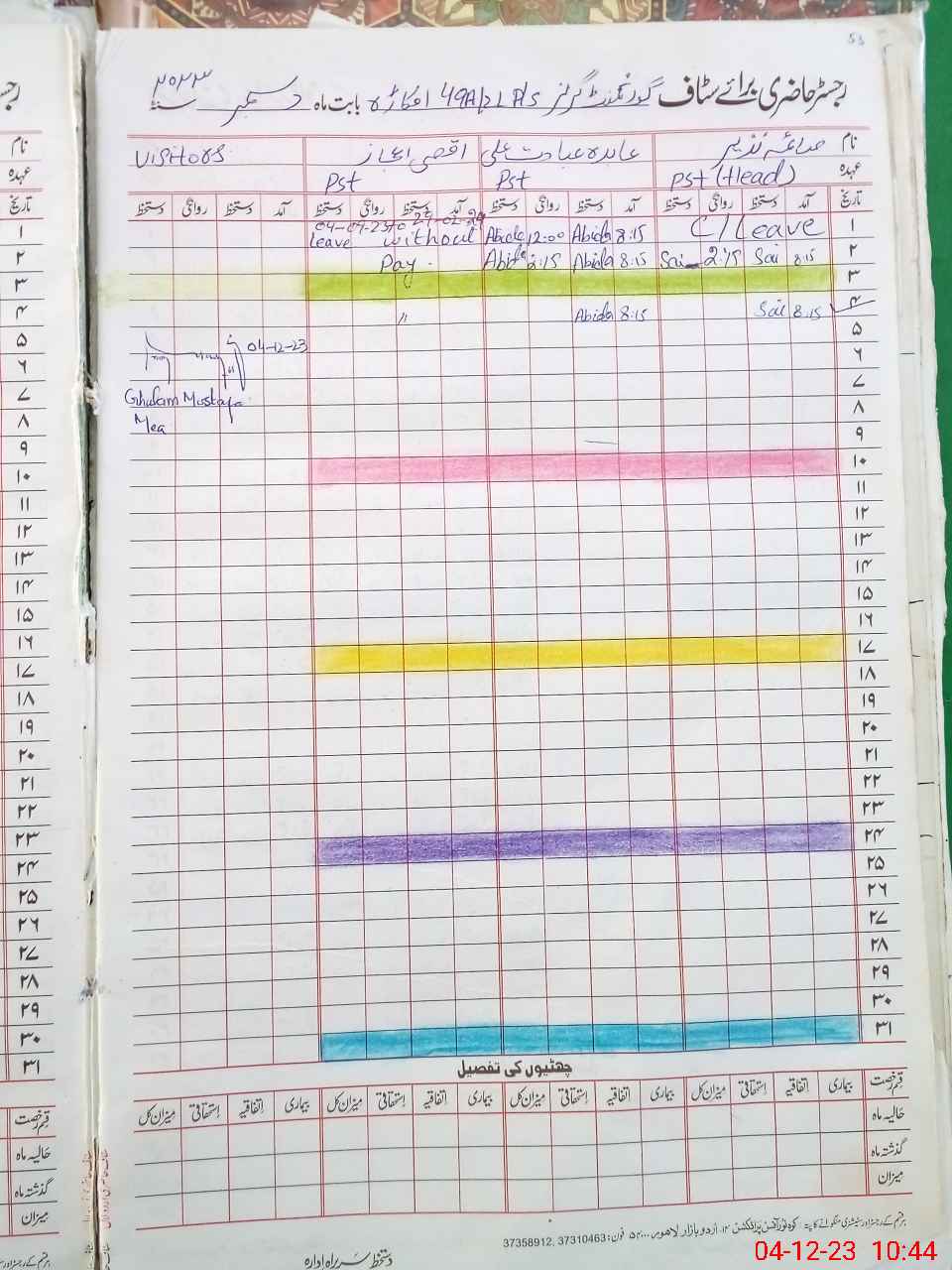 | CNIC | Full Name | Designation | R/C | Absence During Last Calender Month |