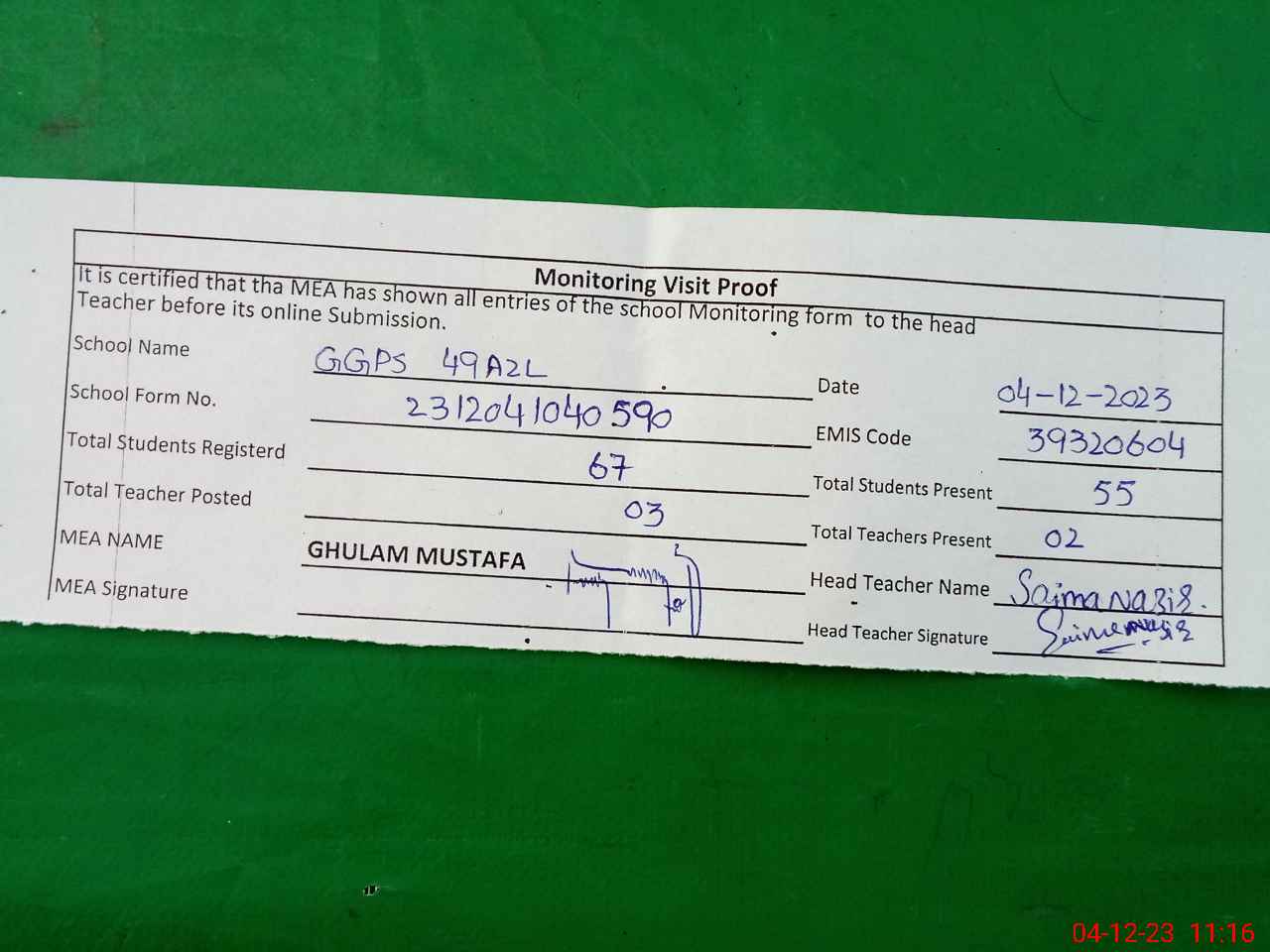 | Attendance Register | Head Teacher | MEA with School | Visit Proof |